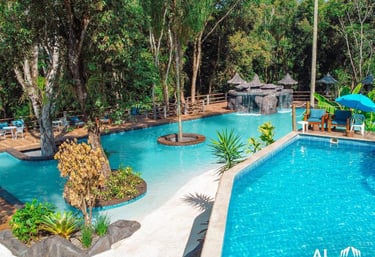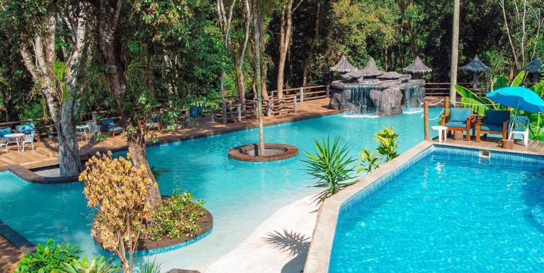 Acesso aos ofurôs e piscinas, todas com água mineral (mesma da fonte das Termas municipais) aquecida por caldeira, a única piscina fria é a praia artificial.